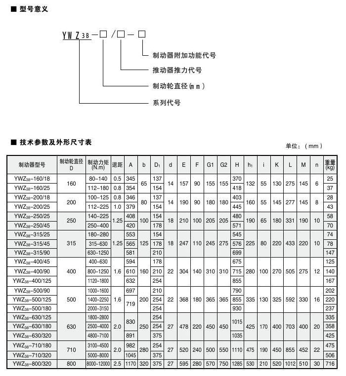 YWZ3B系列电力液压鼓式制动器的连接尺寸和制动力矩参数符合GB6333-86标准,技术要求符合JB / T6406-2006标准, 本系列取代原YWZ3系列制动器。