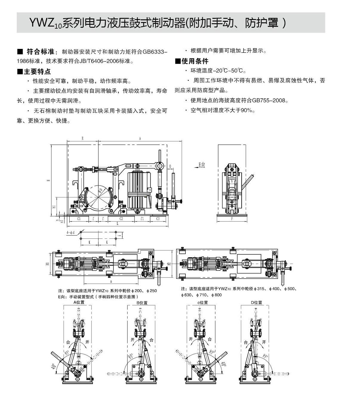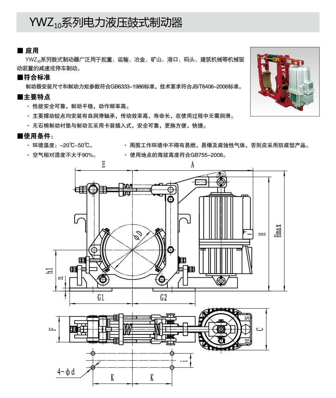 YWZ10,YWZ12系列电力液压鼓式制动器的连接尺寸和制动力矩参数符合GB6333-86标准,技术要求符合JB / T6406-2006标准,配套符合DIN15430标准的Ed系列推动器。