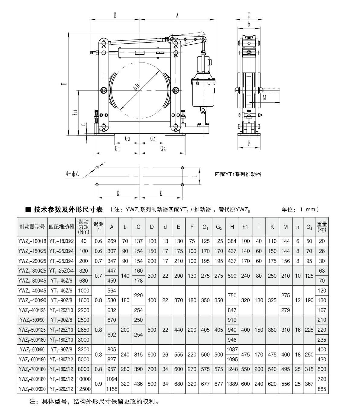 YWZ(YT1)系列电力液压鼓式制动器的连接尺寸和制动力矩参数符合JB/ZQ4388-86标准,技术要求符合JB / T6406-2006标准。