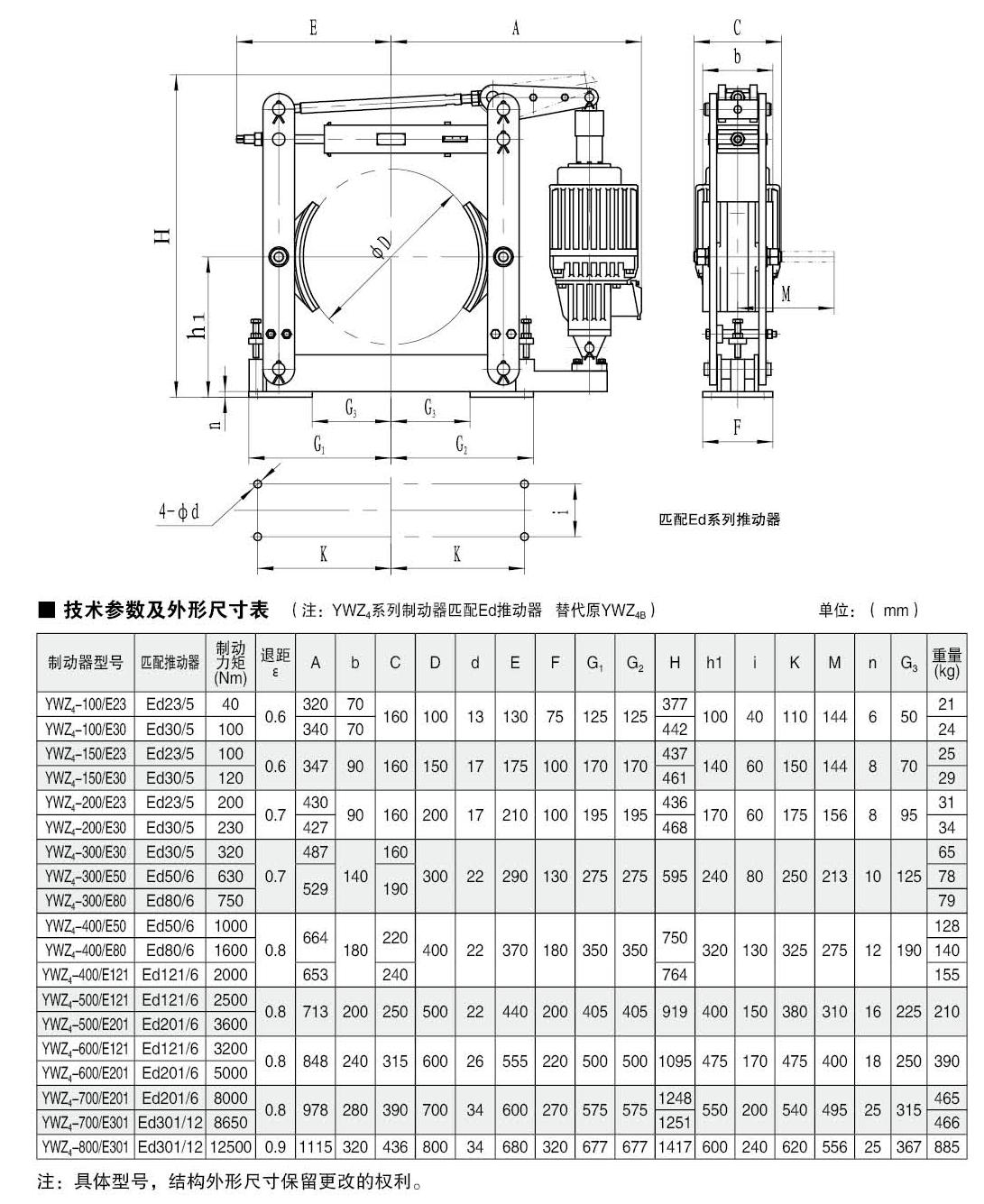 YWZ4(Ed)系列电力液压鼓式制动器的连接尺寸和制动力矩参数符合JB/ZQ4388-86标准,技术要求符合JB / T6406-2006标准。